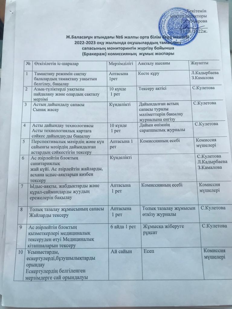 20 январь 2023 0 1 2 3 4 5 Ж.Баласағұн атындағы №6 жалпы орта білім беру мектебінде тамақтану сапасының мониторингін жұмыс жоспары